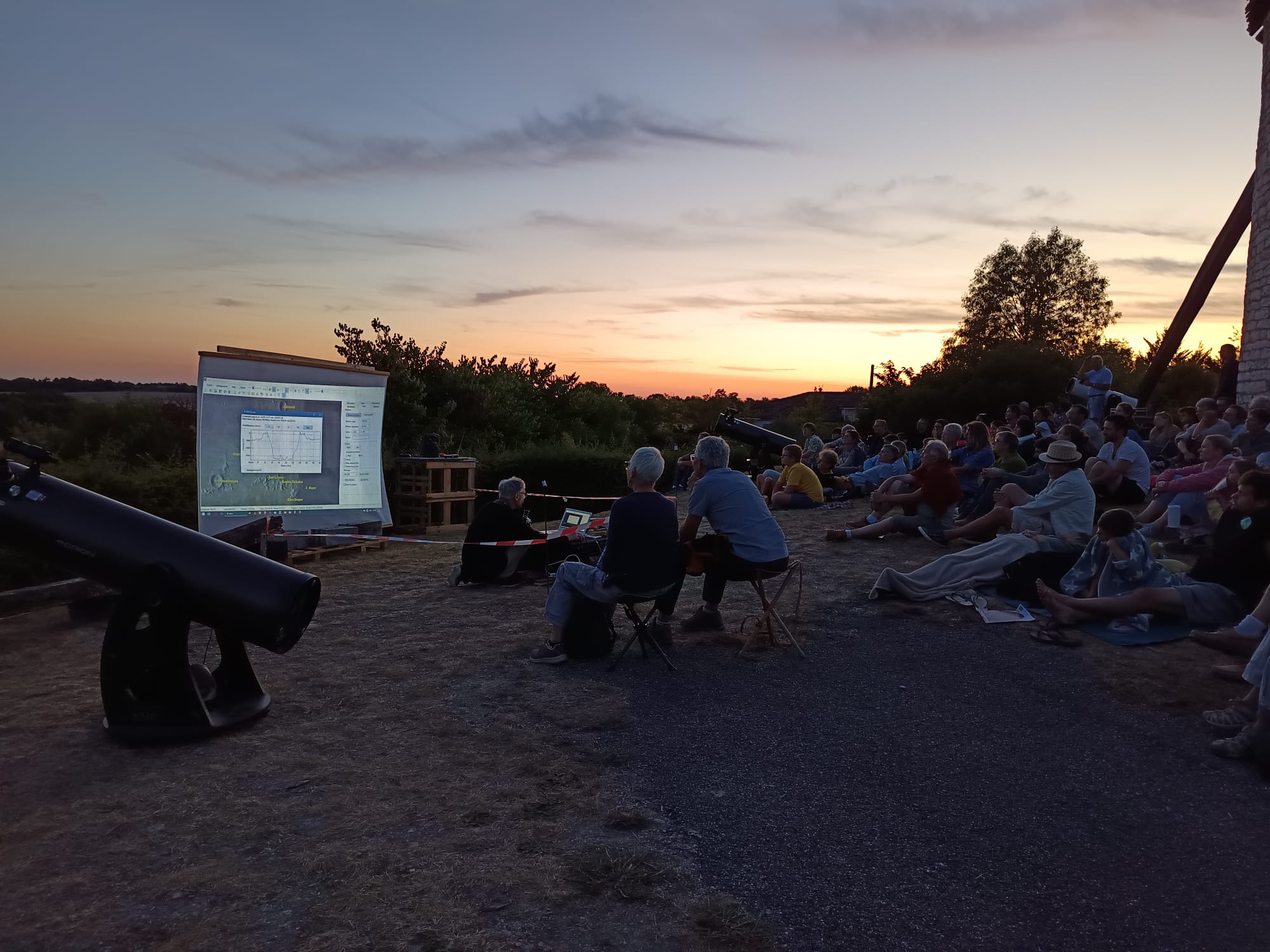 Le soir, Christian Legrand a animé une session d'observation astronomique au Moulin de Boisse  avec l'Amicale Ste Alauzienne et le Club Astro de Gigouzac (Lot). 150 personnes ont pu assister à une conférence en plein air sur la Lune de Christian Legrand. Puis le public a pu observer la Lune et de nombreux objets du Ciel Profond dans des télescopes jusqu'à 300 mm de diamètre avec les commentaires de Christian Legrand. La session s'est terminée par la vision de Saturne et de ses anneaux. Un grand moment pour de nombreux participants.