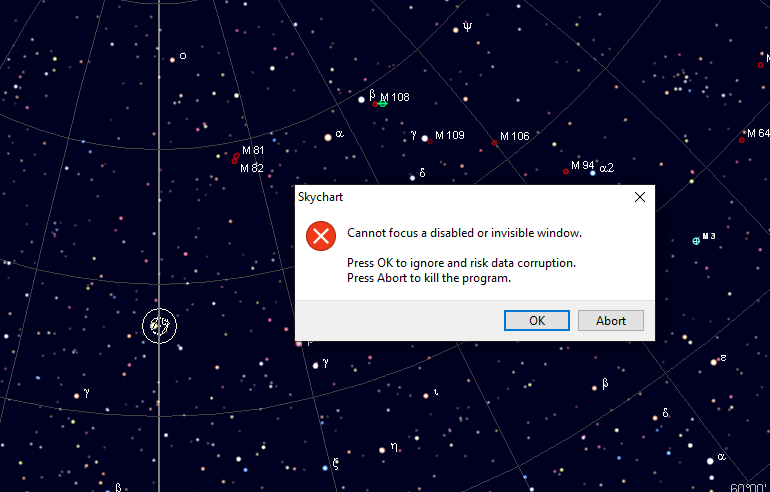 DescriptionAfter connecting to a telescope, clicking Hide, or closing out of the ASCOM telescope interface dialog, then returning to it, an error dialog will show reporting "Cannot focus a disabled or invisible window. Press OK to ignore and risk data corruption. Press Abort to kill the program."