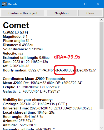 DescriptionFor comet C/2022 E3 (ZTF) the dRA looks wrong. CDC reports -08.30s but the RA rate today about -80 arcsec/hour. The dDec looks good. See attachment.