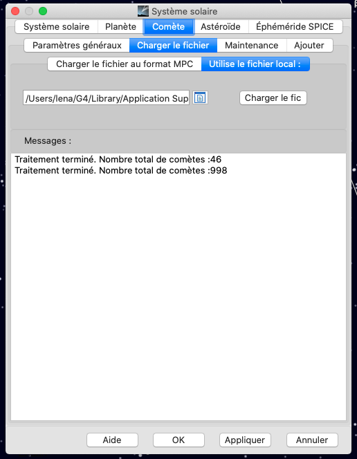 Je vous suis très reconnaissant, c'est en effet la cause, et cela fonctionne pour 2023, en affichant la comète que vous me suggérez, ou d'autres, y compris P1/Halley, avec leur label et caractéristiques. Petit défaut : le pictogramme 'comete' n'apparaît pas, bien que je l'ai activé dans Système solaire/Planète. Comment puis je fabriquer un fichier DAT pour des dates éloignées dans la passé, ce qui me serait précieux pour un livre que je prépare et qui rendra hommage à CdC ? J'ai lu dans les diverses anomalies listées que l'on peut désormais rentrer les comètes une par une, avec un fichier .txt, mais je ne vois nulle part la procédure ? Ou bien faut il un fichier .DAT, mais comment le construire. Sinon, je puis rentrer les éléments un par un dans Paramètres/système solaire/comete... Merci encore, et très cordialement |