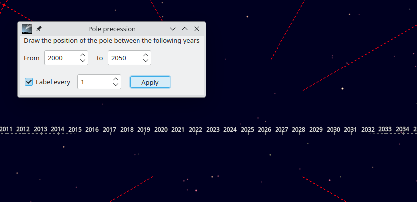 The function is implemented by : https://github.com/pchev/skychart/commit/9437842efa06eb86e2dc03dc9a226b87a91e928f You can test by installing a temporary version from https://vega.ap-i.net/tmp/skychart/ Will be in standard beta version next Monday. Open the menu View / Pole precession. Enter the date range and if you want mark or labels, click Apply. The circles are removed when this form is closed. The pole path is show for both North and South pole. Attached two example: prec-2023.png : the detail for the currents years. prec-all.png: the precession for the full range of validity of Vondrak 2011 theory, -200k to +200k. Tell me if OK for you. |