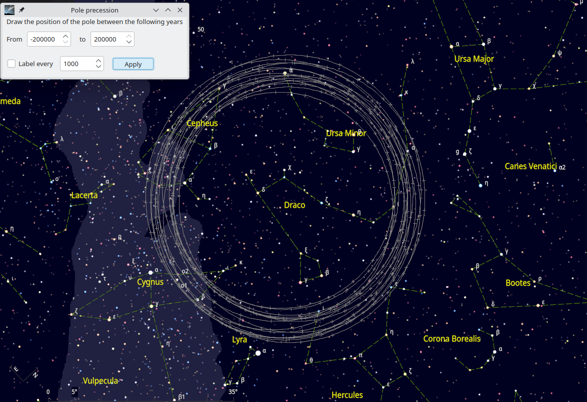 | Description | Since CdC is fairly accurate in its precession model, it would be nice to be able to see the precession circle visualized in the sky. | ||||