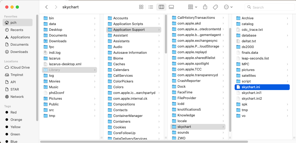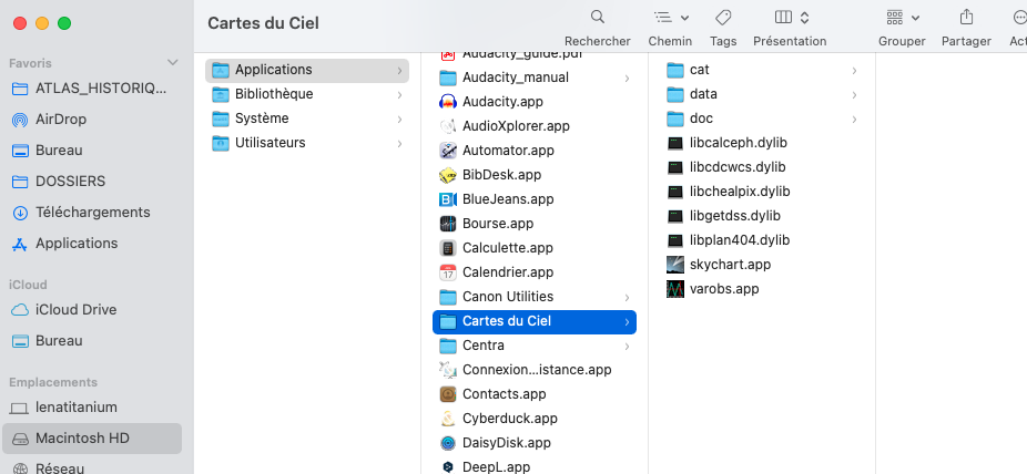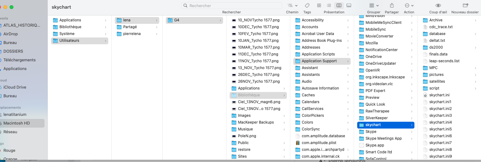 Ma Library/application support ne contient pas skychart ! Dans les APPLICATIONS, il y a un dossier qui s'appelle carte du ciel. Il contient les dossiers cat, data, doc ainsi que l'appli skychart.