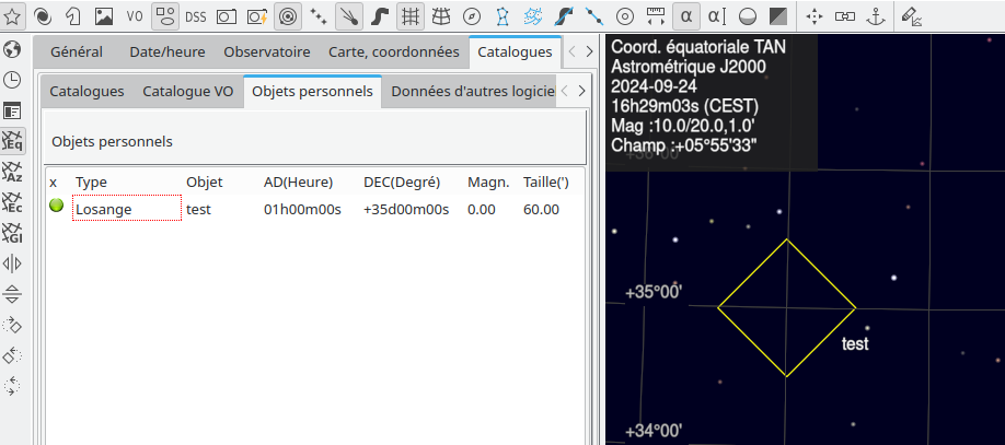 Depuis la dernière version beta cela fonctionne pour les catalogues et objets personnels. A installer depuis https://sourceforge.net/projects/skychart/files/0-beta/2024-09-23/