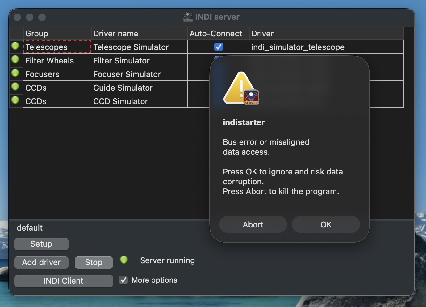 | Description | Hi Patrick, Running CDC on it's own. I opened CDC first then ran and started Indistarter, running simulation drivers. Connected telescope. Selected various options within CDC, slewing to various objects, just getting familiar with program. All seemed to rum OK. Disconnected telescope, closed and saved program. Closed Indistarter and this message appeared. Selected abort, Program closed. Cheers Rob | ||||