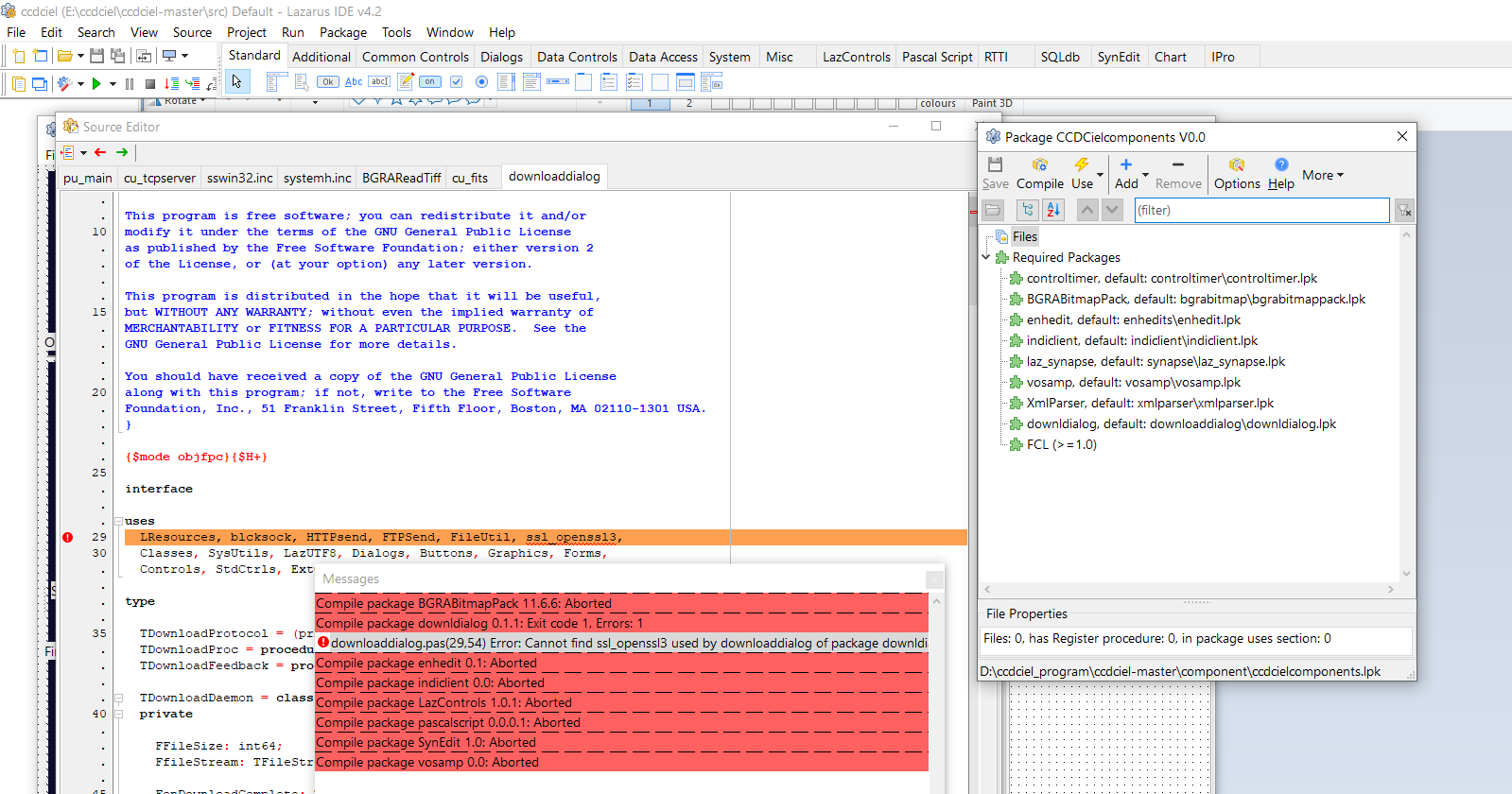 Hello Han, For me ccdcielcomponents.lpk at line 37 contain: <Item5> <PackageName Value="laz_synapse"/> <DefaultFilename Value="synapse/laz_synapse.lpk"/> </Item5> Is it the case for you? The error in cu_tcpserver is maybe because of the use of an untyped constant that get a different default type on your system. Can you try to replace the line 116: NoSocket = -1; by: NoSocket :longint = -1; |