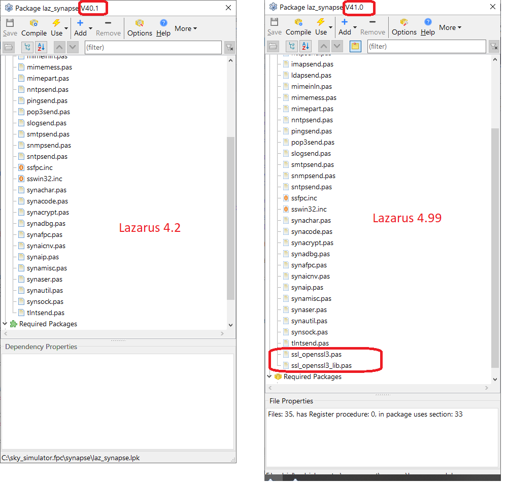 From the screenshot the package V40.1 you have with the version 4.2 is from a skysimulator directory. It look like an old version missing the ssl3 support. You cannot remove ccdcielcomponents because it is never installed, this is just a pseudo-package with a list of requirement. This is a facility to not have to open and install every lpk in all the subdirectories. But you can remove laz_synapse and install another one. You can have only one per lazarus installation, just be sure to select the right one. |